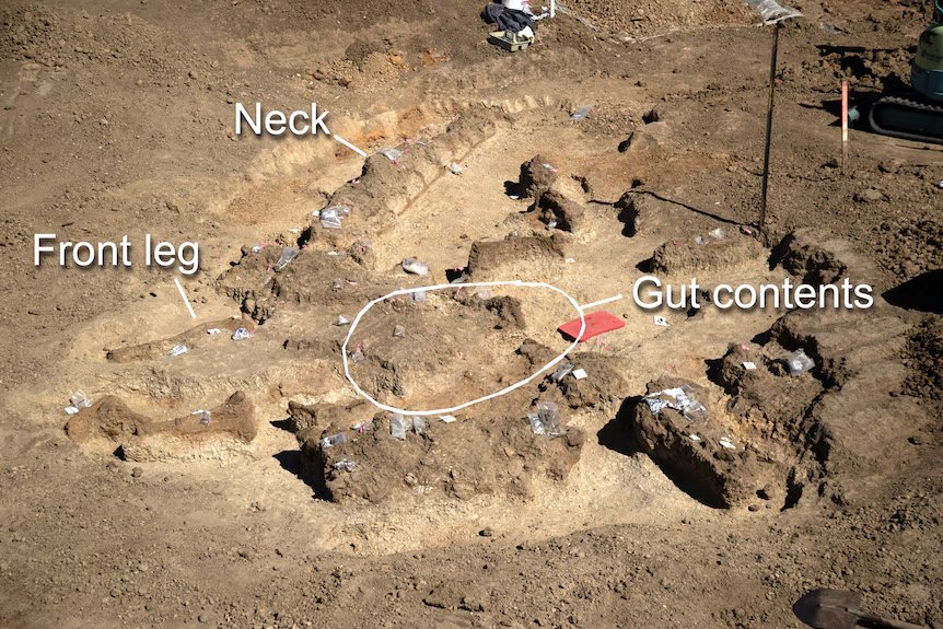 The actual dig where Diamantinasaurus matildae was excavated showing the location of the animal’s stomach contents. For the first time paleontologists can examine exactly what a sauropod ate and how they ate it. (Credit: ABC News)