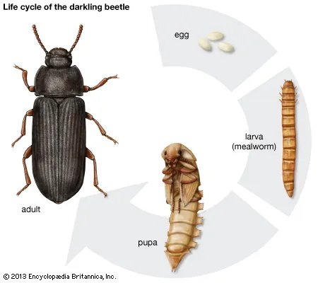 The life cycle of a typical beetle goes through four stages, egg, larva, pupa and finally adult. Notice how the larva looks nothing like the adult, this makes it difficult to know what larva goes with what adult, especially when you’re dealing with an extinct species! (Credit: Britannica Kids)