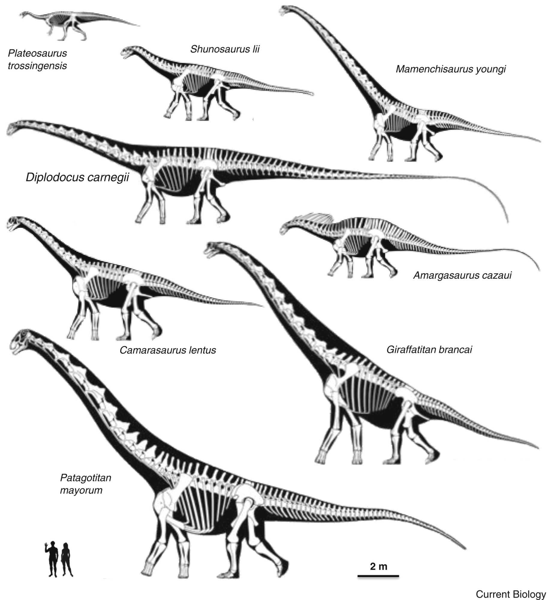 Sauropods lived throughout the age of the dinosaurs and came in many sizes. Just by looking at them and you can tell that they were all plant eaters. (Credit: Cell Press)