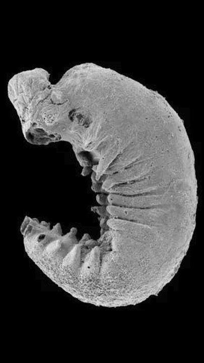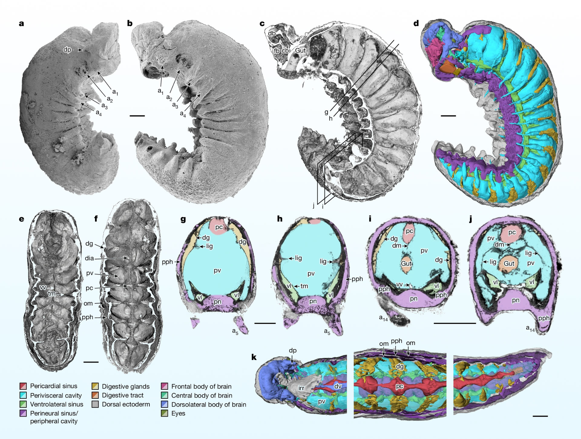 That’s why finds such as the 520 million year old specimen of Youti yuanshi are so remarkable. The small fossil, less than 4mm in length, somehow not only preserves virtually all of the soft parts of the larva’s anatomy but, unlike most arthropod fossils which are squashed flat, the specimen maintained its three dimensional shape. This enabled the researchers to reconstruct the internal arrangement of the animals organs. Not only muscle tissue but digestive organs were preserved along with traces of the circulatory system and even the presence of a ‘protocerebrum’, in other words a brain.