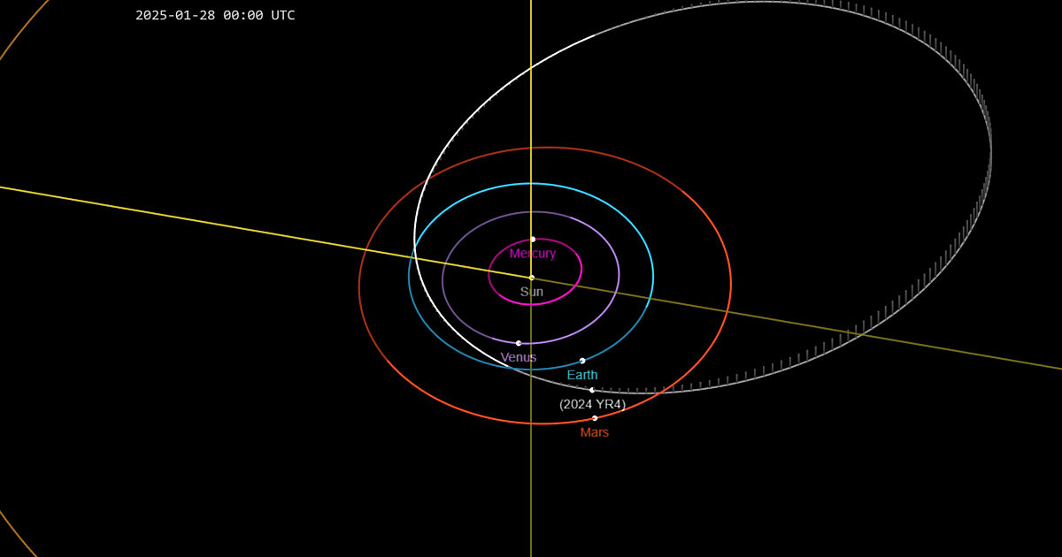 The orbital path of asteroid 2024 YR4 (Big Ellipse) brings to close to our planet (Blue Circle) on a regular basis. Of course close in outer space can mean millions of kilometers so any collision could be millions of years away. In any case 2024 YR4 will not strike the Earth any time soon. But it could collide with the Moon! (Credit: The Planetary Society)