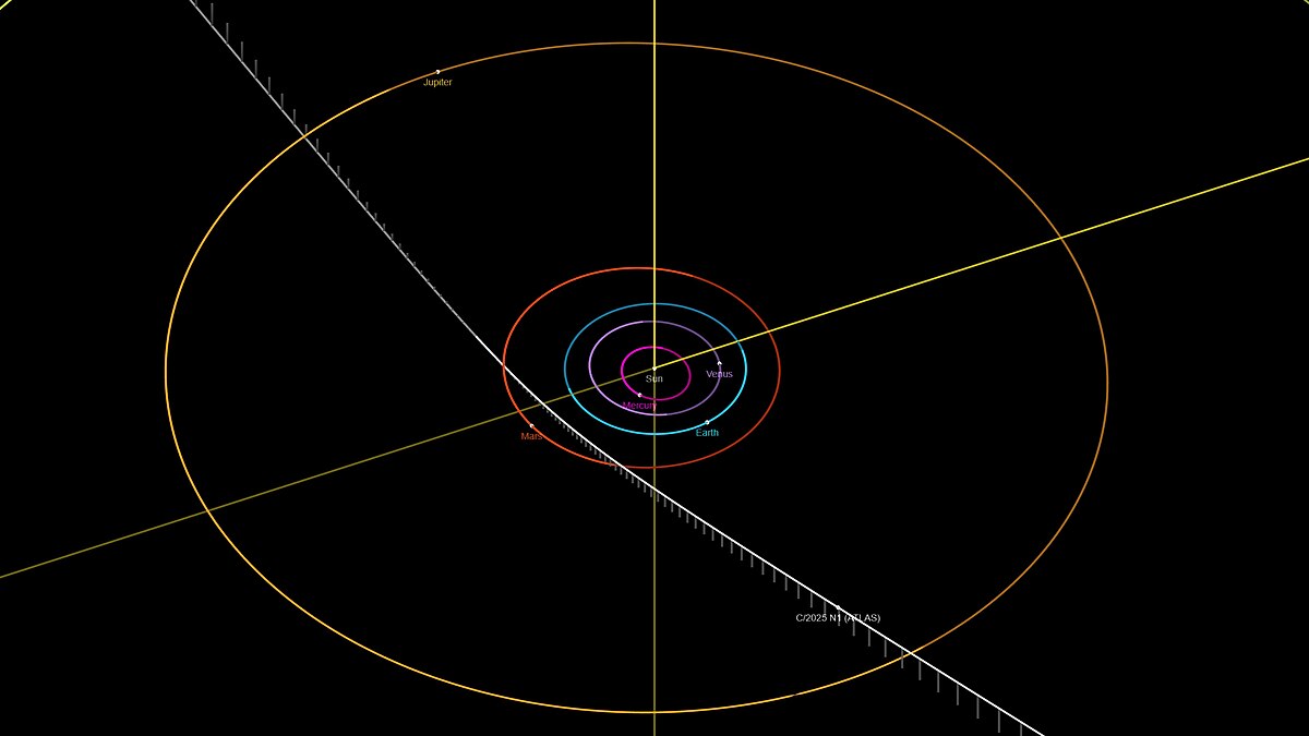 3I/Atlas is moving so fast through our solar system that even the gravity of the Sun will barely deflect its trajectory. Notice how it will not come anywhere close to Earth. (Credit: en.m.wikipedia.org)