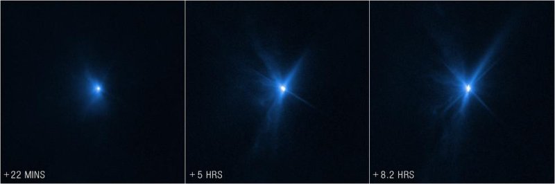 These images, taken by ground based telescopes, show how the debris from the Dart-Dimorphos collision spread out over several hours. The fact that the debris seems clustered in several streams is hard to explain. (Credit: UPI)