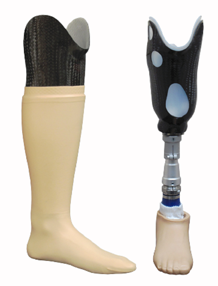 Two different styles of artificial leg. The remaining limb is inserted into the cup at the top of the artificial leg but as the patient moves, chafing occurs where the two meet causing great discomfort for many patients. (Credit: IndiaMART)