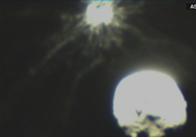 Actual image of DART crashing into Dimorphos taken by the small cube satellite that accompanied DART. Observations since then have confirmed that DART altered the asteroid’s trajectory by more than was anticipated, a true success. (Credit: NEW Scientist)