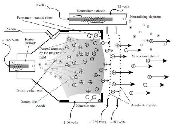 Ion rocket engines use electric voltages to accelerate charged atoms. Although they only produce a small thrust they can burn for months or even years eventually producing a much higher total change in spacecraft velocity or ‘Delta Vee’. (Credit: Aerospace Notes)